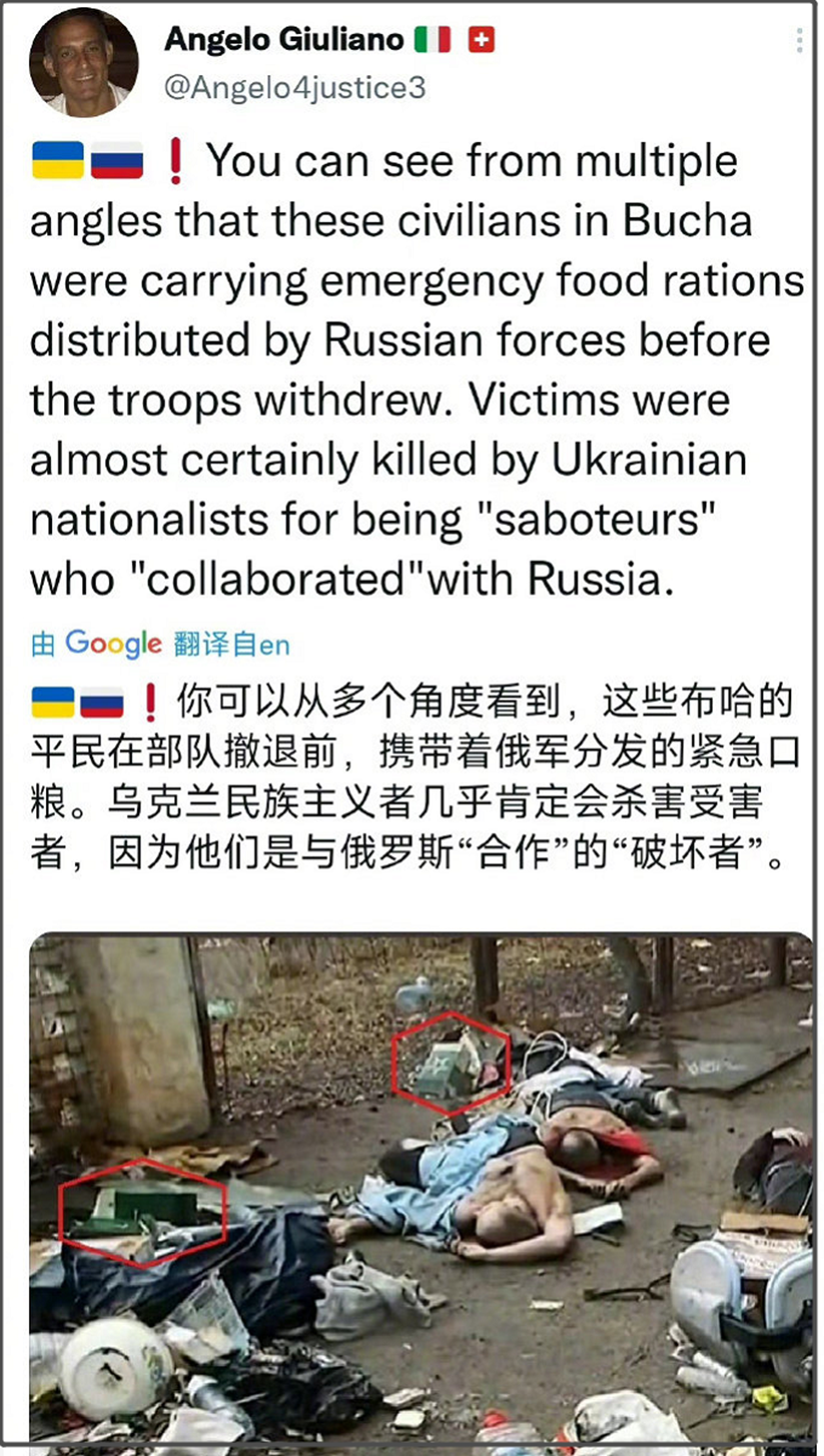 该意大利网友认为该很多被杀的平民尸体,身上都携带着俄军分发的紧急口粮。