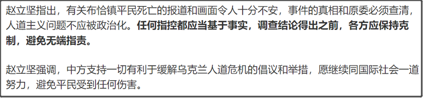 我们驻联合国代表是表示“有关布查市平民死亡的报道和画面令人十分不安,事件的相关情况和具体原因必须查清。任何指控都应基于事实,结论得出之前,各方应保持克制,避免无端指责。”