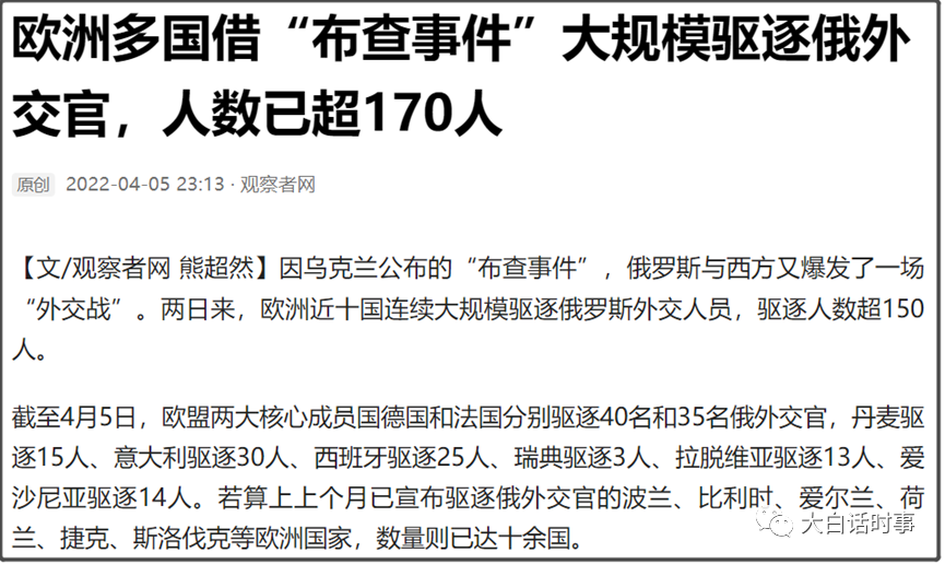 然后欧洲多国也响应美国号召,开始通过“布查事件”大规模驱逐俄罗斯外交官,截止4月5日已经驱逐了超过170人。