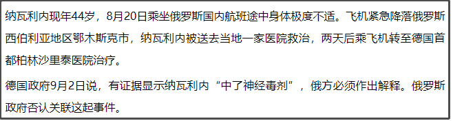 这个事情是这样的,俄罗斯反对派人士纳瓦利内8月份于西伯利亚疑似中毒后昏迷,然后他就被送往柏林接受治疗。