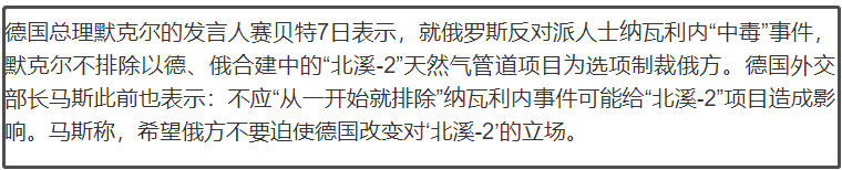 而就在北溪2项目已经即将完工的关键时间点,出来这样一个“中毒”事件,导致一直坚持将北溪2项目完工的德国,也开始说不排除会暂停北溪2项目。