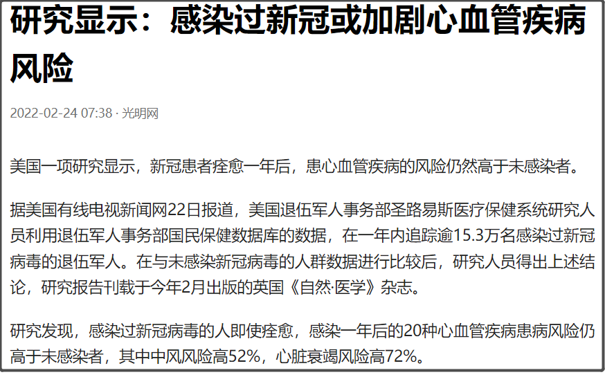 根据美国退伍军人事务所的研究显示,研究人员在一年内追踪逾15.3万名感染过新冠病毒的退伍军人,结果显示,感染过新冠病毒的人即使痊愈,感染一年后的20种心血管疾病患病风险仍高于未感染者。