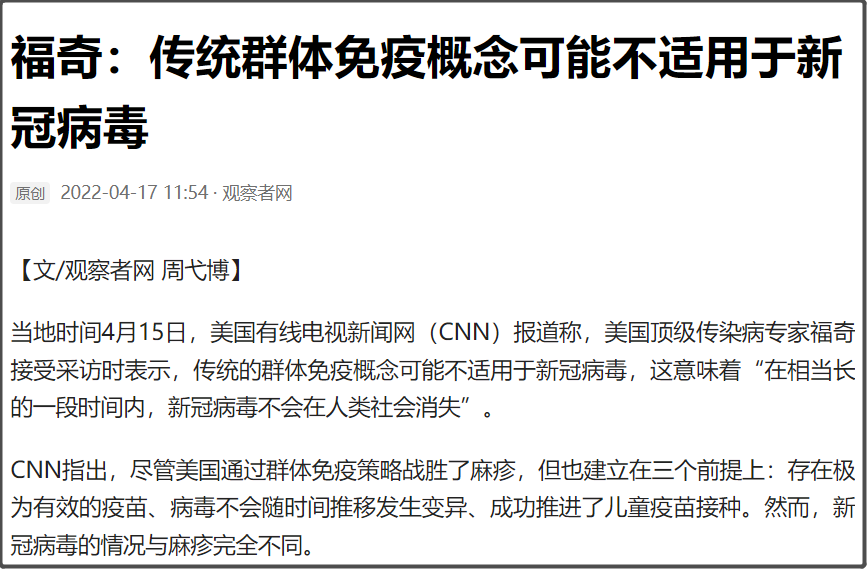 就连美国知名传染病专家福奇,在4月15日接受采访时表示,传统的群体免疫概念可能不适用于新冠病毒。但福奇之前也是鼓吹群体免疫。