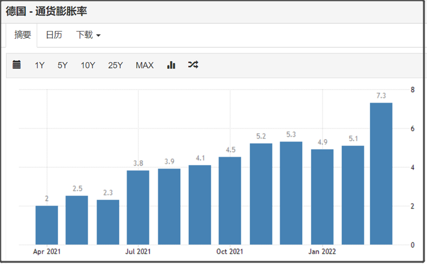 德国3月的通胀率也是大幅度飙升至7.3%。
