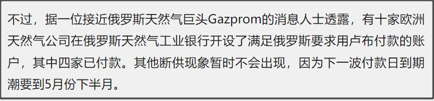 由于4月1日开始供应的天然气是在4月下旬或5月结算,所以外界之前也普遍预计,要到4月底才会出现俄罗斯对欧洲天然气断供的事情。
