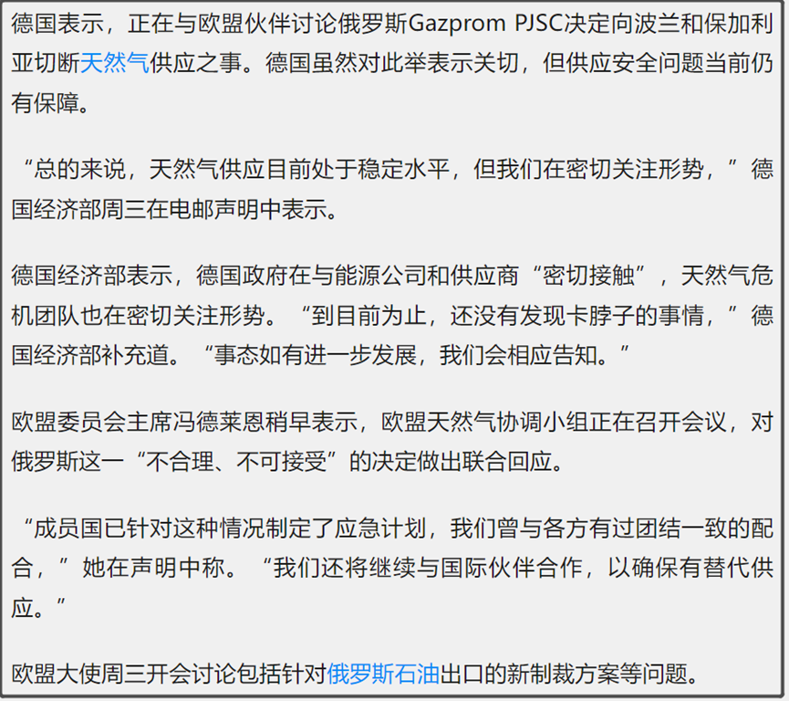今天俄罗斯正式暂停对波兰和保加利亚的天然气供应。