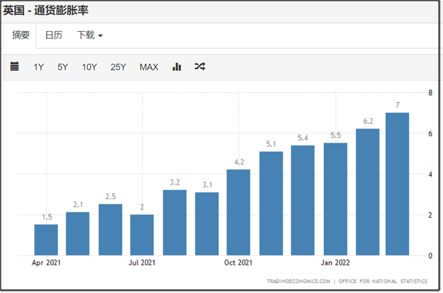 另外一方面,英国通胀率也已经飙升到7%。