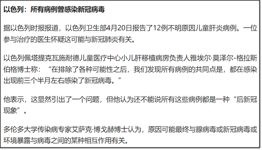 以色列对12例不明原因儿童肝炎病例,不是简单检测个阳性,而是去进行调查,并发现其中11名儿童曾经感染过新冠病毒。