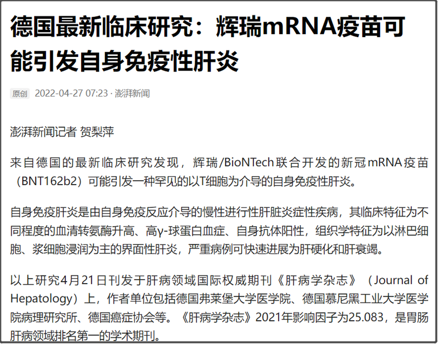 此外,最近比较引发人关注的还有一个消息是,德国最新临床研究:辉瑞mRNA疫苗可能引发自身免疫性肝炎。