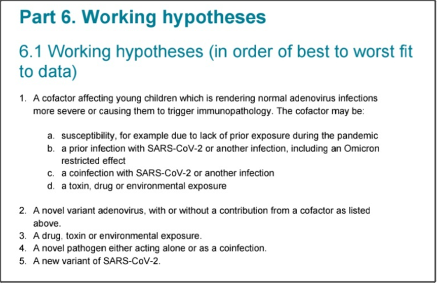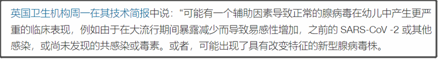 这些猜想里包括腺病毒变异、新冠病毒变异、其他病原体与新冠病毒共感染、大流行期间缺乏接触。