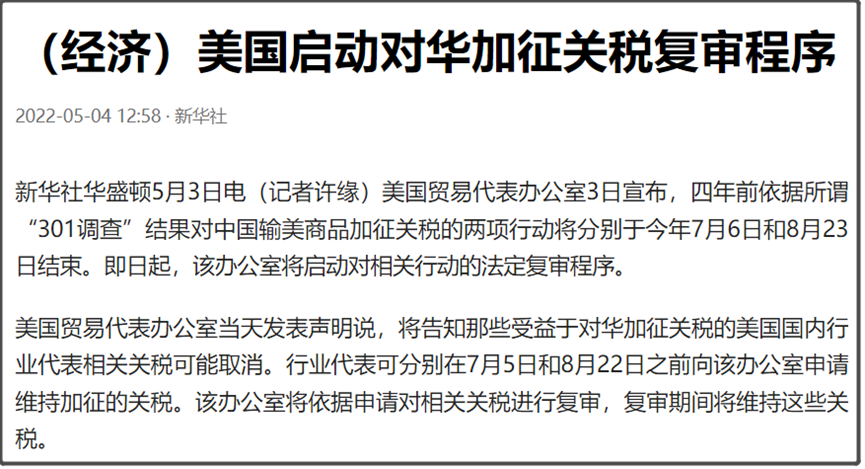 一个是美国贸易代表宣布,启动对华加征关税的复审程序。