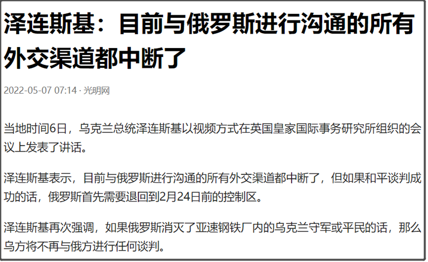 在5月6日,泽连斯基再次强调,如果俄罗斯消灭了亚速钢铁厂内的乌克兰守军或平民的话,那么乌方将不再与俄方进行任何谈判。