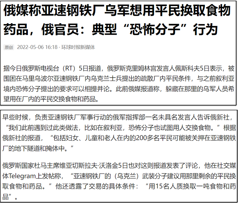 其中俄罗斯媒体还报道,困守亚铁成的乌军还提出用平民交换食物和药品的条件,还透露了具体交易条件是“用15名人质换取一吨食物和药品”。