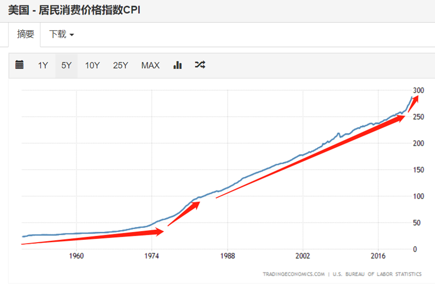 所以,从1974年~1980年就成为美国二战后第一个通胀失控的时间周期,这段CPI指数明显有一个斜率大幅度抬头的现象。