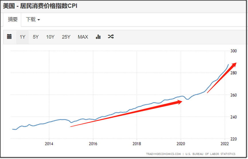 如果只看这个同比增长数据,还比较不直观的话,我们可以直接看美国的CPI指数。