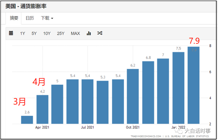 这个是因为美国一年前的通胀率是从4月份开始失控,去年3月,美国的通胀率还只有2.6%。