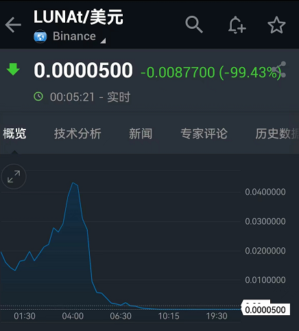 在跌到0.01美元后,一度反弹到0.04美元,涨了4倍,结果呢,一下子又跌倒了0.00005美元。