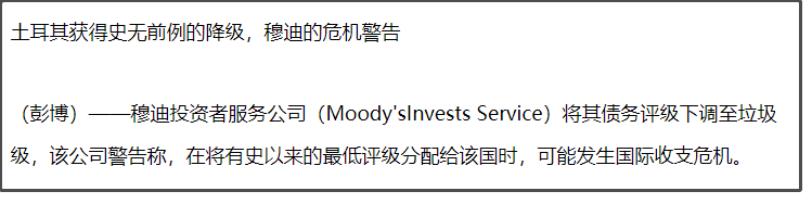 这也使得在前段时间,穆迪史无前例的把土耳其的债务评级给下调到了垃圾级。