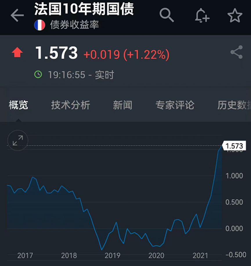 法国的10年期国债收益率也从去年的0利率,一路飙升到现在1.5%。