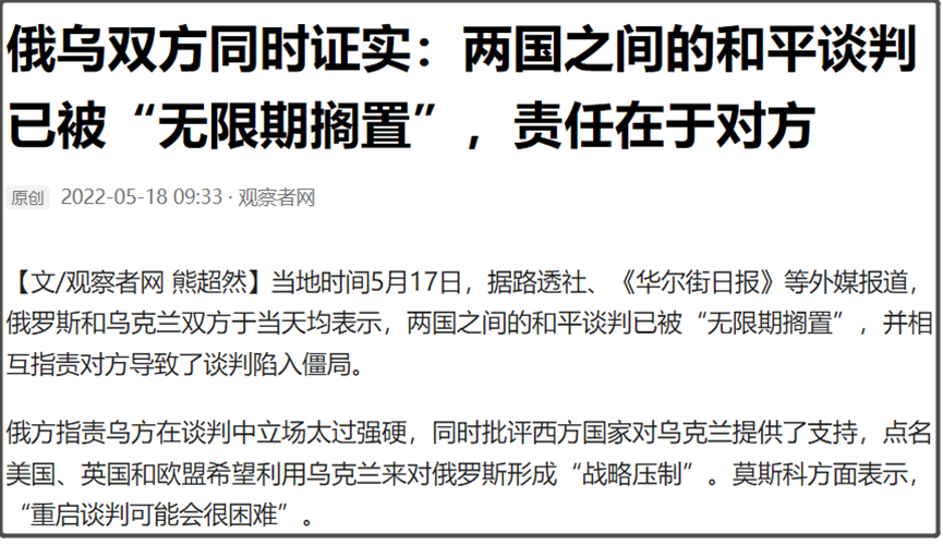 就在5月17日,俄乌双方均表示和平谈判已被“无限期搁置”,并互相指责对方导致谈判陷入僵局。