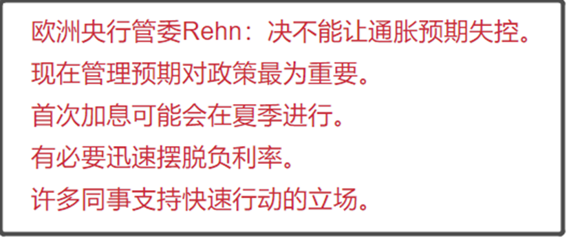 欧洲央行表示,绝不能让通胀预期失控,首次加息可能会在夏季进行,要迅速摆脱负利率。