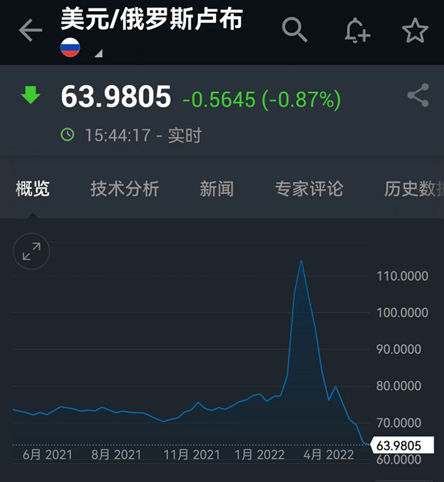 但随着俄罗斯要求欧洲各国使用卢布支付天然气,卢布汇率就从114,一路升值到现在的64,接近翻倍的升值幅度了。