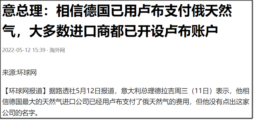 意大利总理最近表示,他相信德国最大的天然气进口公司已经用卢布支付了俄天然气的费用,并且大多数进口商已经开设了卢布账户。