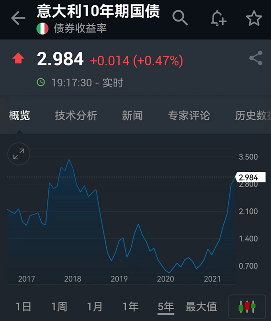 而老欧洲国家里经济比较差的意大利,10年期国债收益率也从去年的0.7%,一路飙升到现在3%。