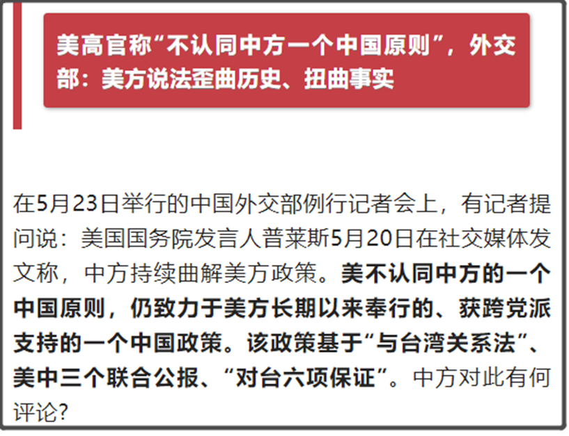 在5月20日,美国国务院发言人甚至在社交媒体公开表示,声称“美不认同中方的一个中国原则”,并致力于美方所奉行的“一个中国政策”。