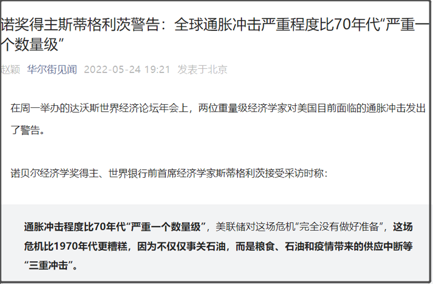 这个观点,最近诺贝尔经济学家得主,世界银行前首席经济学家也在达沃斯世界经济论坛上,发生这样的警告,认为当前全球通胀冲击严重程度,比上世纪70年代,还要严重一个数量级。