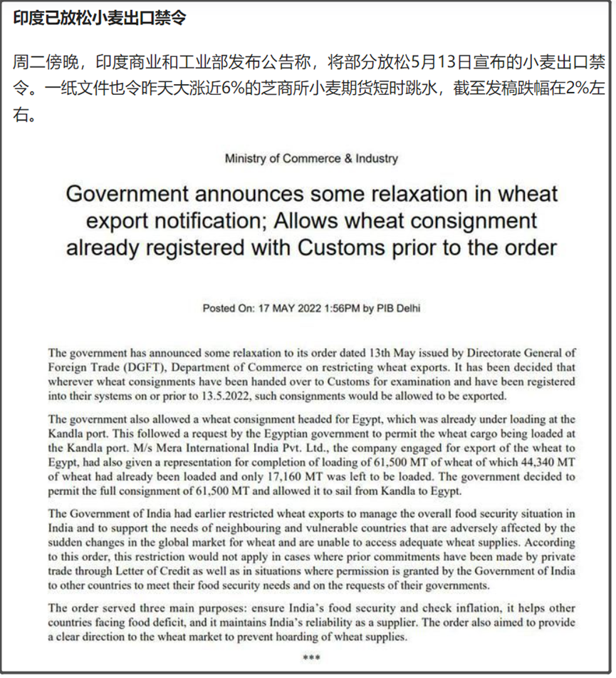 在各方压力之下,上周二,印度也是稍微放松了小麦出口禁令。