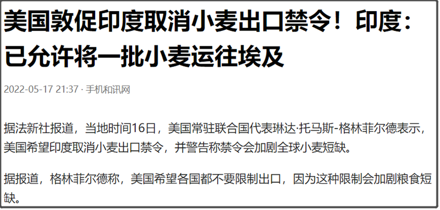 就连美国这个世界粮食第一大出口国,都跑出来敦促印度取消小麦出口禁令。