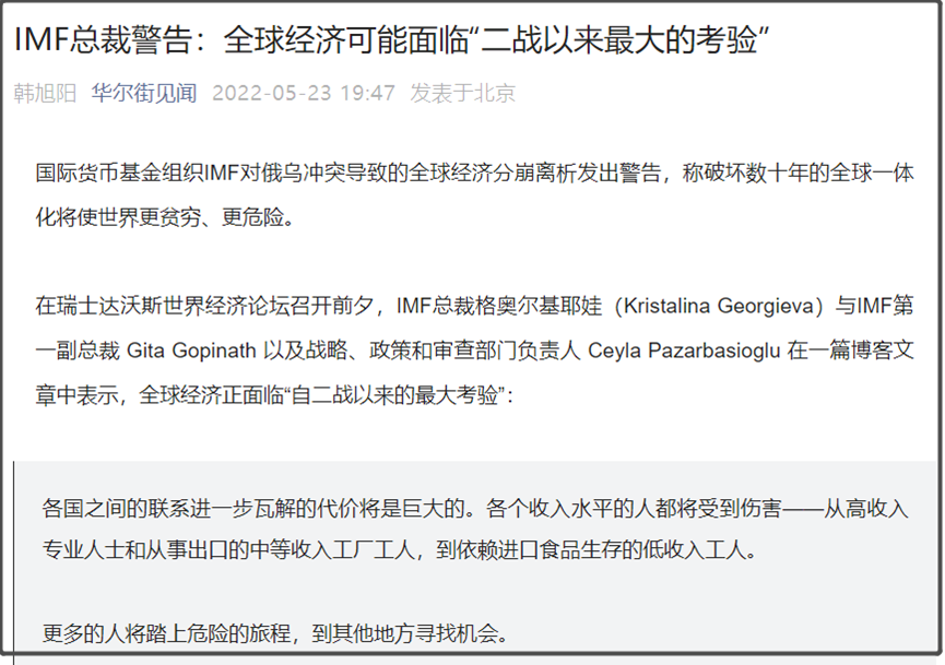 最近IMF总裁跑出来警告称,当前世界经济面临“二战以来最大考验”。