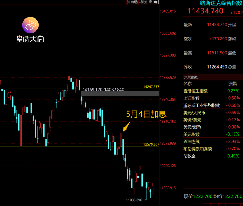 可以看到,5月4日晚上,美联储加息后,纳斯达克一度大涨3%。