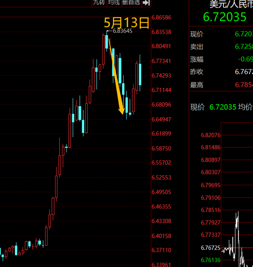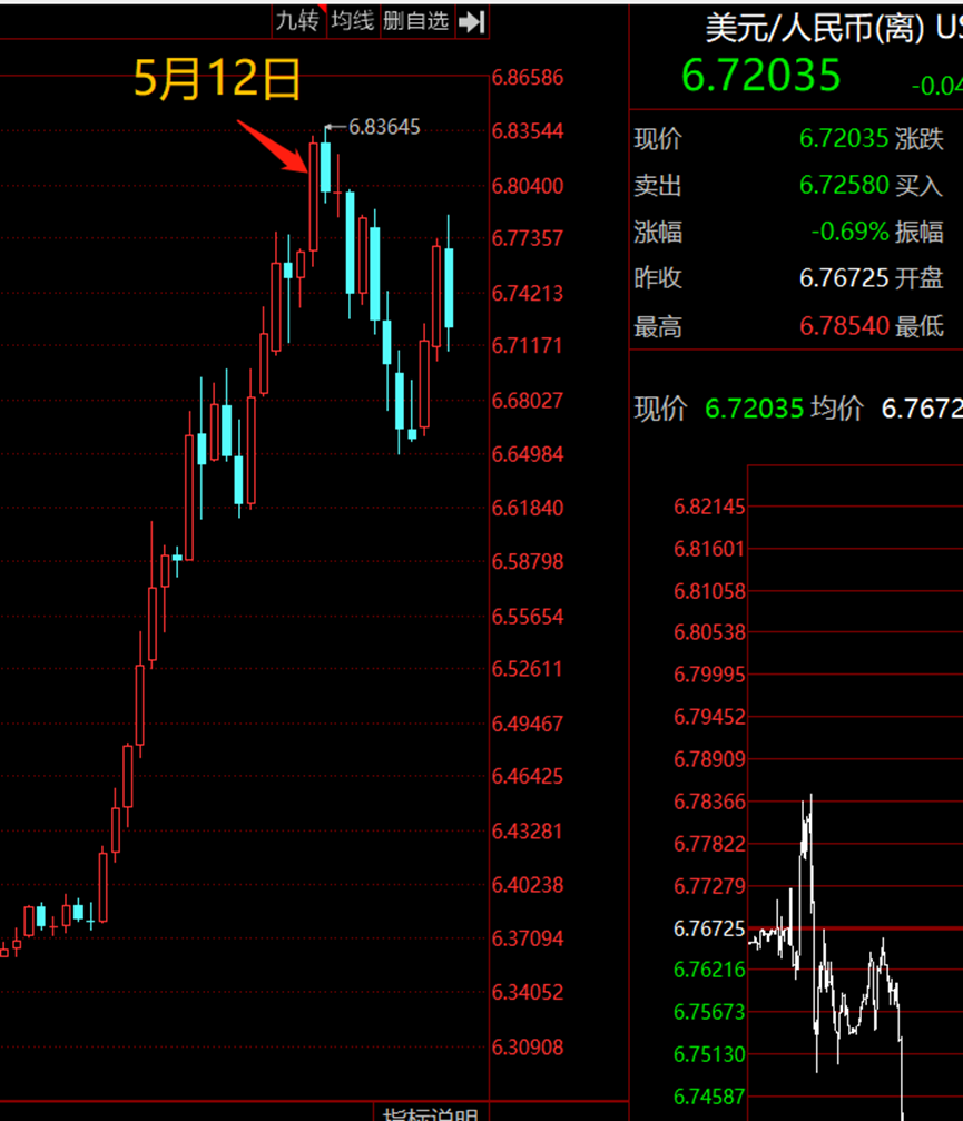 在5月12日,人民币汇率又出现较大幅度贬值,一度贬值到6.83。