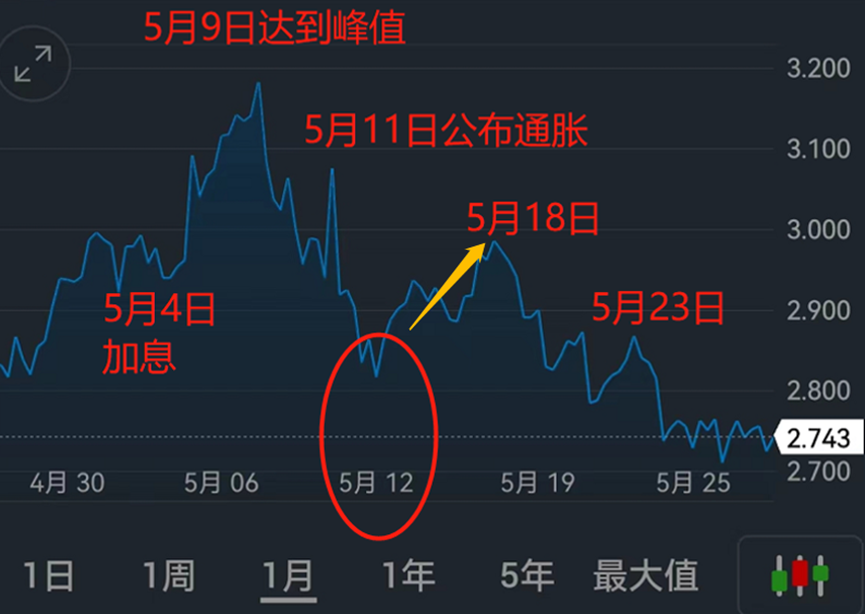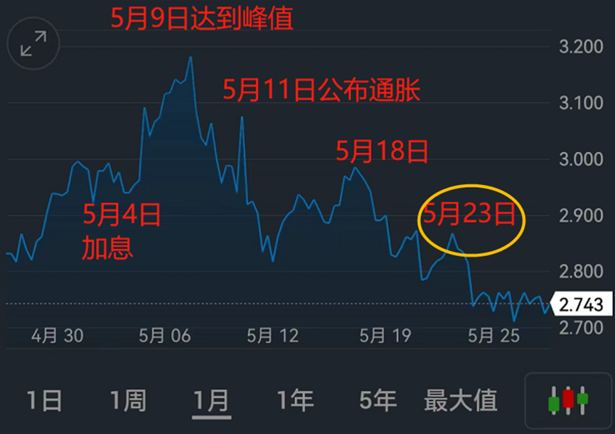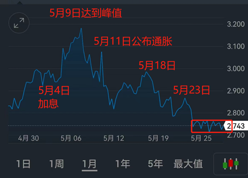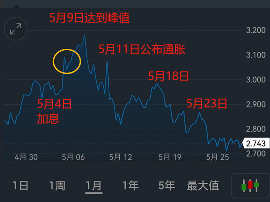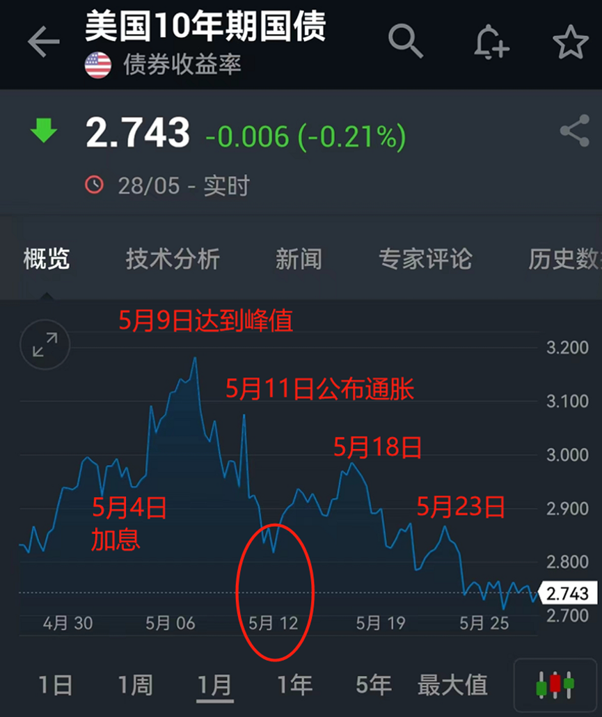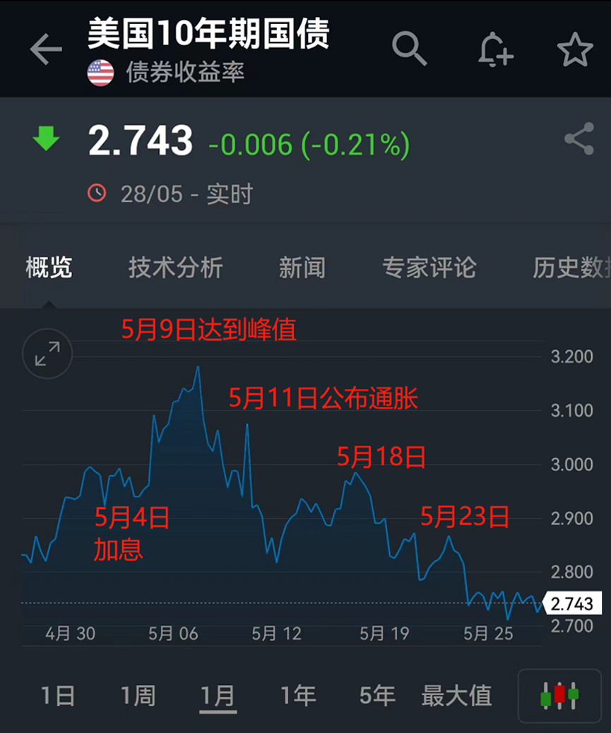 可以看到,在5月4日美联储加息后,美债收益率就大幅度冲高,然后一路涨到了5月9日达到了一个峰值,一度快要摸到了3.2%。
