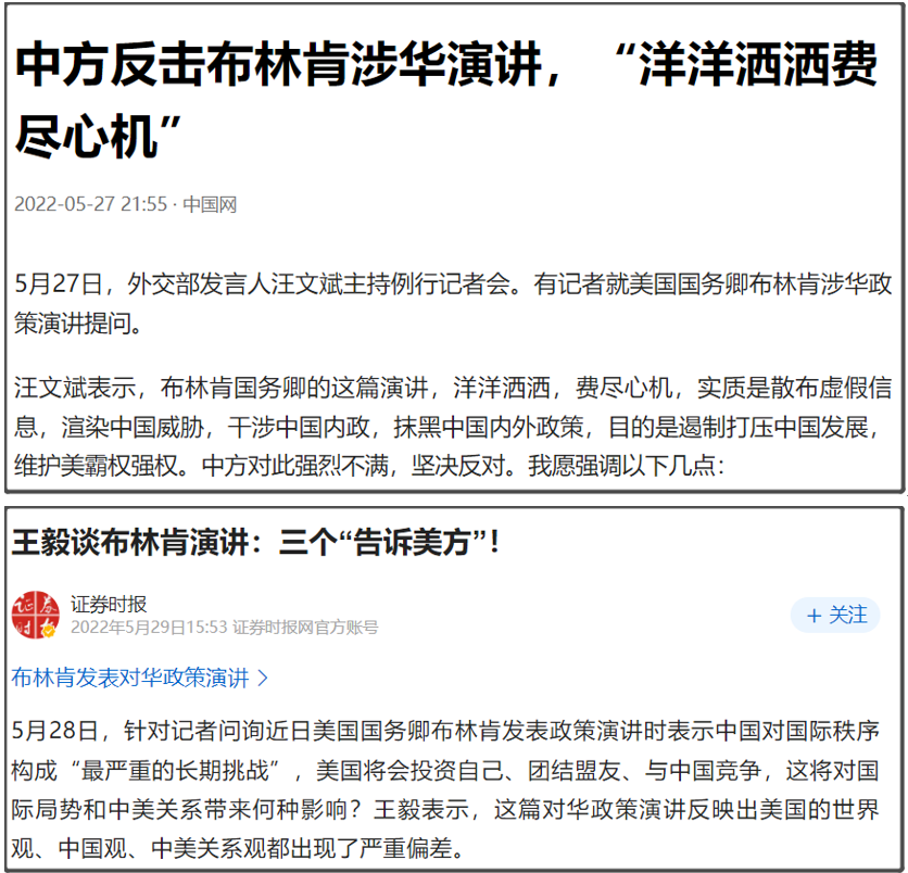 最后,到了5月26日,美国国务卿布林肯发表了针对我们的演讲。