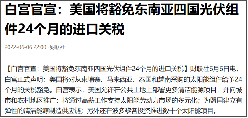 比如,6月6日美国宣布,将豁免东南亚四国光伏组件24个月的进口关税。