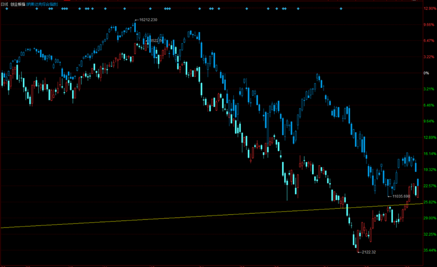 我把纳斯达克指数跟创业板指数叠加在一起,图里的虚K线是纳斯达克指数,实体K线是创业板指数。