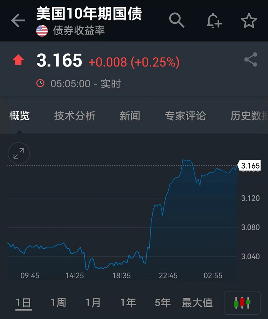 其中,美国10年期国债收益率,一口气涨4%,已经达到3.165%。