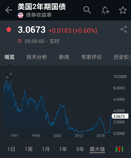 昨晚,美国2年期国债是大涨8%,一口气涨到3.07%。
