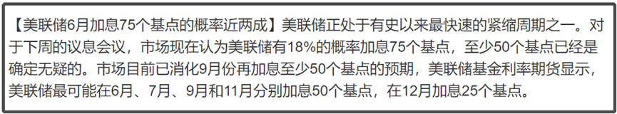 之前市场预期6月加息75个基点的概率,已经基本为0。
