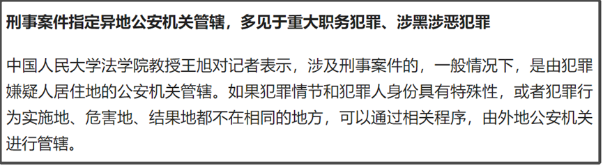 有专家表示,异地侦办多见于重大职务犯罪、涉黑涉恶犯罪。
