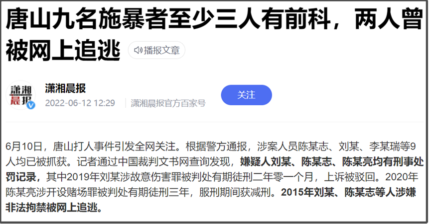 最近刷屏的唐山围殴打人的恶性事件,引发人们广泛愤慨。