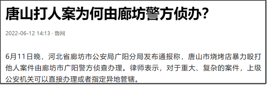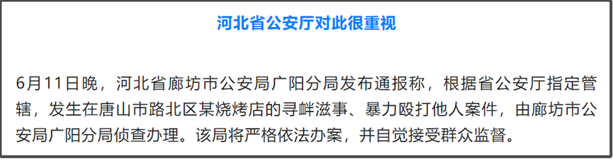 我注意到,6月11日晚,河北省廊坊市公安局广阳分局发布通报称,唐山市烧烤店暴力殴打他人案件由廊坊市广阳警方侦查办理。