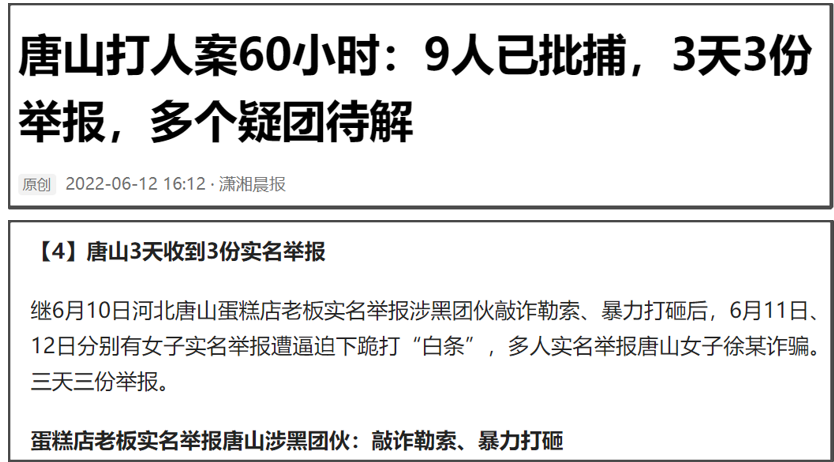 有媒体报道在唐山打人案发生后,3天就出现3份实名举报。