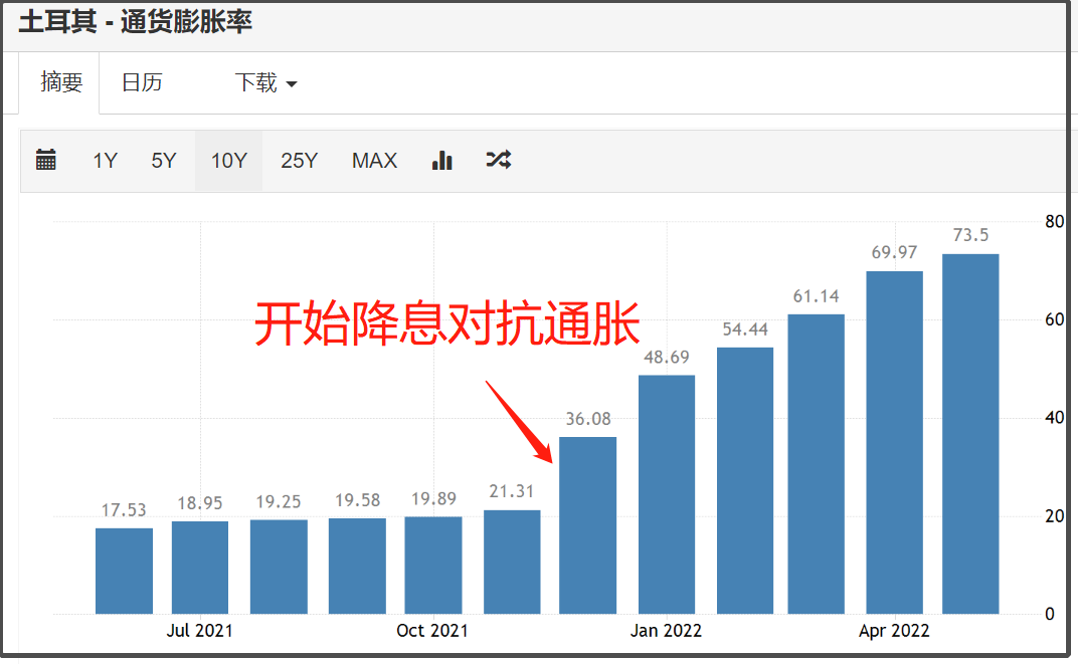 但在埃尔多安降息对抗通胀的魔法操作后,土耳其通胀率就直线飙升到现在73.5%的通胀率。