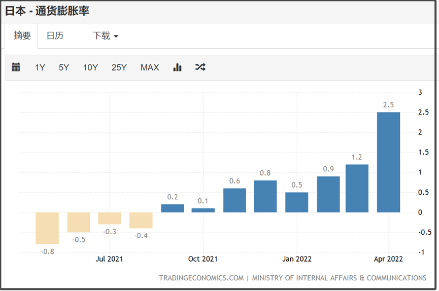事实上,日本上个月公布的4月通胀率就已经大幅度上涨到2.5%了,已经开始有通胀飙升的苗头。