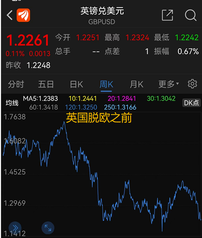 英国脱欧之前,汇率最高达到过1英镑换1.76美元,但现在只能换1.22美元,过去7年累计贬值幅度达到30%。