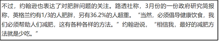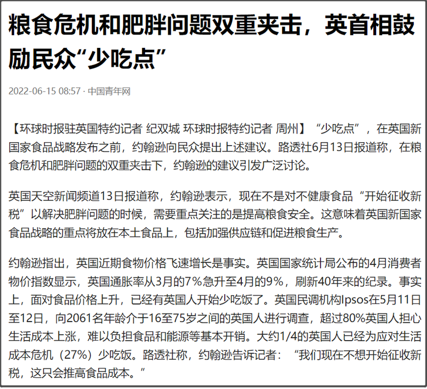 不过虽然约翰逊原话是说“最好的减肥方法就是少吃。”但因为这句话是英国新国家食品战略发布之前,也有在讨论通胀飙涨的问题。